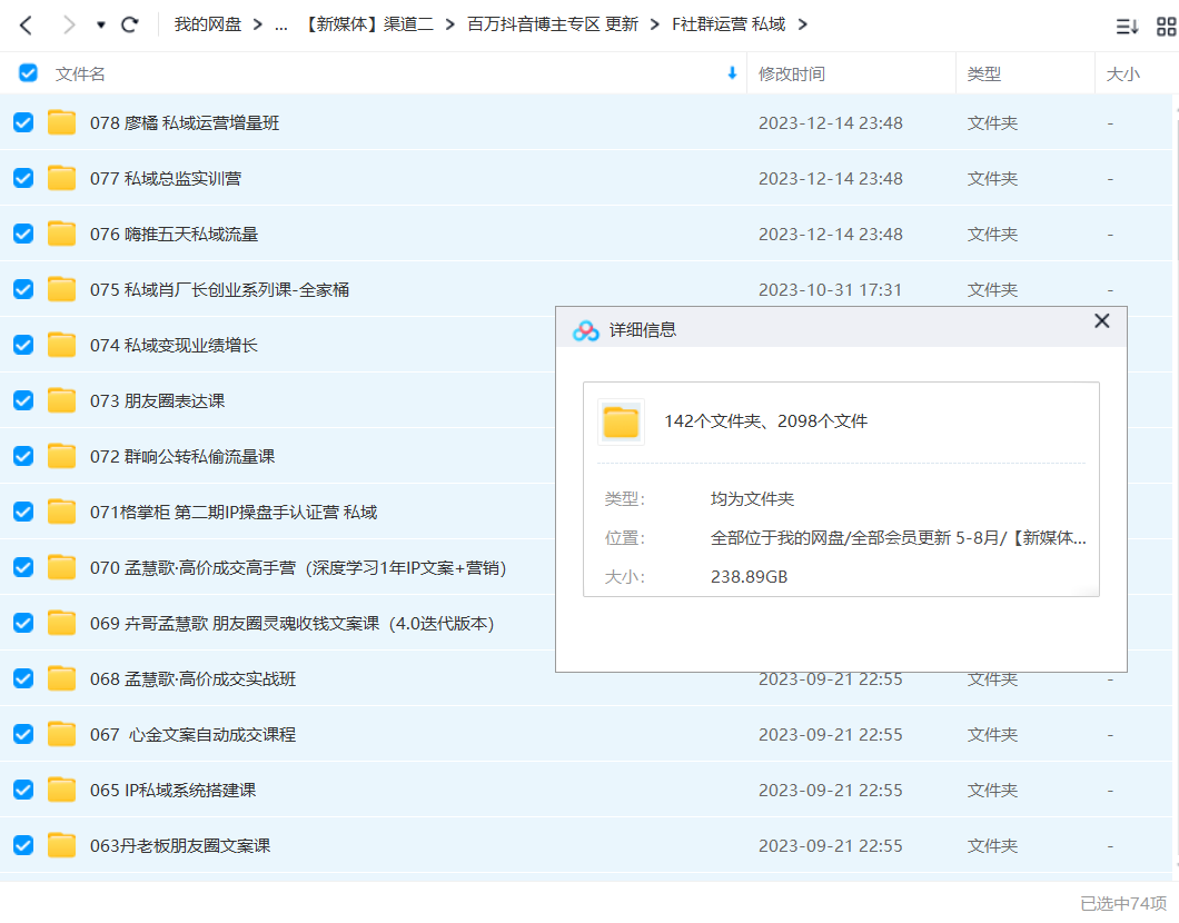 E社群运营 私域 096嘴嘴私域IP变现高手课 095 OKR目标梳理教练课程 094嘴嘴手把手带你做OKR读书会 093阿May私域裂变陪跑计划 092私域流量运营与转化实战 090阿甘私域AD内部学习 089帆书社群21天0基础社群创收营 088私域2.0:企业私域策略实战课 087【淘百万】社群变现实操课 087爆款文案写作课:做好文案策划提高转化率,不花钱也能打造爆款(19节课) 086 白杨SEO-打造个人IP视频课 085 搭建高转化的私域流量池 084 玩转社群引流课程_超哥变现教练 083 电商私域操盘手成长训练营 082 阿MAY 私域运营实操培训课 081 2023年度金滢IP私域变现营 080伊万私域线下课学习笔记 079超级社群-高端私域社群从0到1增长实操课 078廖橘私域运营增量班 077私域总监实训营 076嗨推五天私域流量 075私域肖厂长创业系列课-全家桶 074私域变现业绩增长 073朋友圈表达课 072群响公转私偷流量课 071格掌柜第二期IP操盘手认证营私域 070孟慧歌·高价成交高手营(深度学习1年IP文案+营销) 069卉哥孟慧歌朋友圈灵魂收钱文案课(4.0迭代版本) 068孟慧歌·高价成交实战班 067心金文案自动成交课程 065 IP私域系统搭建课 063丹老板朋友圈文案课 062宋老师卖课老师私域卖课营新版 061玩赚朋友圈系统课,朋友圈月入10W的秘密 059私域成单-新时代下专业代理人的成交必修课_陈雪琴 058美业文案虹吸私域流量打造实用工具包课程 055铁三角美学变现营第十期 054.卖课老师私域卖课营_宋老师 053私域流量成交课程 052peter公域转私域品牌训练营一期(11月20号) 051线下9980无删减毛毛姐 050微信私域运营手册微信私域流量100问 049有赞学堂私域运营实战课 048波波来了案例库 047 8000万用户规模增长方法论-私域如何助力业务跃迁的?|见实私域提效营专家课699 046.蔡文川21天获客销售营:从陌生到成交的微信经营术 045廖桔《私域商业模式总裁班》2天拿走价值百万的私域顶层设计方案 044廖桔《私域流量变现速成班》4天线下课程全高清版 043煤老板第3期·打爆IP创富计划7天线上课 042.煤老板私域爆单陪跑营-2期 041吴晓波《波波的每周私域案例课》 040.草草·私域留量精准成交术 039.原力网赚粉月入6万私域流量倍增独家 038.肖厂长私域必修课25节 037私域流量运营法则 036.巧卖圈私域营销学习 035.【完结】比高私域IP流量变现视频课 034.赚钱社群系统运营葵花宝典 033群响·私域成长训练营「O5期」 033.赵睿·企业微信营销管理实操全攻略 032秋叶社群运营实战营 031.私域成交实战营 030.鉴锋亲授:微信生态如何低成本裂变获客 029私域增长实战训练营2期 028.私域运营项目SOP表格合集 027.S商学院·14天朋友圈文案训练营 026微商-龚文祥 025-陈维贤私域商业操盘手培养计划第三期 024-青年社群社群运营实战训练营 023社群公社·业态私域营销实战课【水印】 022村西边老王·社群管理及运营系统课【更新中】 021社群变现陪跑计划【完结】 020狼师爷·社群商业操盘手 019肖厂长私域流量创富圈 018.私域流量运营图谱2.0 017.私域流量实战营 016.21天私域流量特训营 015.私域流量运营王炸训练营【完结】 014.数字化营销与私域流量运营(完结) 013超深入的私域流量入门课(完结) 012.波波来了&见习私域第五六期 011.万酵母社群打造课 010.私域商业操盘手 009_2021私域增长万人峰会【完结】 008 12堂私域流量掘金课:从0做出N个赚钱的微信号【更新中】 007.无限制注册威芯号 006.12堂私域流量掘金课:从0做出N个赚钱的微信号【更新中】 005 21天私域销冠实战营 004.社群本源魔法·精准社群连接器【更新中】 003.【小裂变出品】企业微信裂变增长实战课 002.22节微信极速成交术,每月多赚30000+ 001.麦子企业微信运营增长全攻略 ……