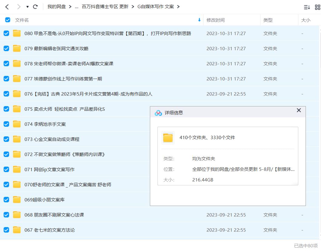 F自媒体写作 文案 063 李欣频-丨-文案创造课 062.杯子灵感课 061.李炳池6月30视频卖货文案 060.田野老师-职业文案全体系方法论 059. 《万全之术–文字催眠金句与模板》 058.21天文案引流训练营 057【完结】北鱼读书写作工坊 056.杯子Glass超级文案课 055. 0227好学微课自媒体VIP高级版 054.南方周末评论写作课-[南周书院](完结) 053 半糖头条爆文训练营202202期 052. 汤小小 故事写作班(完结) 051 文案思维与方法 050.明白的写作课 049 兔妈『爆款文案硬核特种兵孵化营』(超硬核) 048 会员专属课 兔妈文案 047.琼宝宝最强文案 046.我日入10万的文案课第四期 045.朋友圈销售成就计划 044.夜草与千里马7天文案实操训练营第十四期 043.Spenser写作实战营第12期 042.【完结】印象笔记·写作系统行动营 041知音课堂·30天高效读书变现训练营第2期【更新】 040.池骋自媒体 18期 039.叶小鱼·零基础文案写作变现课 038.半糖梦呓高阶写作课 037【完结】A883第二期故事课训练营 036.知音课堂·30天高效读书变现训练营第2期【更新】 035. 刘主编 掌握写作技能 开启副业赚钱之路(完结) 034为你写诗排版课第六期【完结】 033【完结】牛皮明明·深度读书课(官方有更新会补) 032小猫倩倩第八期写作训练营【完结】 031.安妮写作课(第2、3期),价值899元 030.刘主编丨21堂写作变现实战训练营(完结) 029-李炳池 收钱文案 卖货秘密 神笔文案等 028李忠秋·善写14天结构化写作训练营第六期 027 15天剧本杀写作基础营 026 得到·职场写作训练营 025 自燃型文案训练营 024. 三联生活周刊 2021年度(更新中) 023【完结】汤小小轻松高效写作 022内容制作人【完结】 021.新媒体运营专员【完结】 020-wj吴军·阅读与写作50讲 19翻句·职业撰稿人密不外传的训练法 19. 刘媛媛-走向富足的30本财商提升书单(完结) 019李笑来·十年五本书(完结) 018.韩老白30天学会短视频变现:轻松打个100字 每月多赚2W+ 017夏九九〖视频课〗短视频文案赚钱课:可复制的短视频掘金文案,零基础小白也能轻松月入过万 016杨阳 老师短视频文案课程 015花爷的自媒体IP第三期 014-当猩读书会(更新中) 013.刘丽朵故事模版初阶营 012【完结】新媒体商业IP训练营-第2期 011.日入十万的个人品牌课 010. 汤小小故事写作班·第31期 009-非暴力沟通的24堂故事思维课(完结) 008 【完结】粥左罗实战写作课 007男儿国·写作课2.0 006. L先生的写作课【完结】 005.李笑来写作2021(完结) 004.贝小戎书评写作课程 003 2020人物秋季写作训练营 002 南方周末新媒体创意赋能课 001 新媒体营销自媒体运营入门到精通【完结】